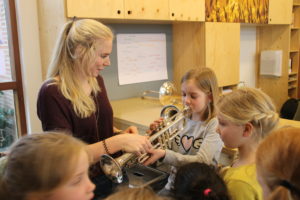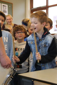 Nadat de leerlingen de juiste instrumentnamen bij geluidsfragmenten moesten raden mochten zij allemaal op de verschillende instrumenten spelen. Van bugel tot trombone, triangel tot saxofoon, alles kon worden geprobeerd. Aan het eind van de les mochten alle leerlingen hun top 3 opschrijven en aan de hand hiervan wordt een orkest gevormd.