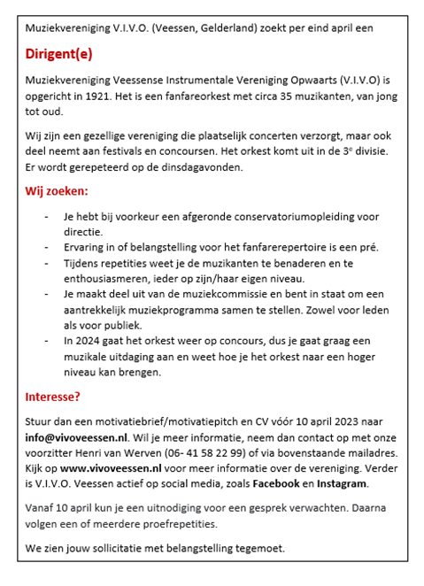 Muziekvereniging V.I.V.O. Veessen zoek dirigent(e)
