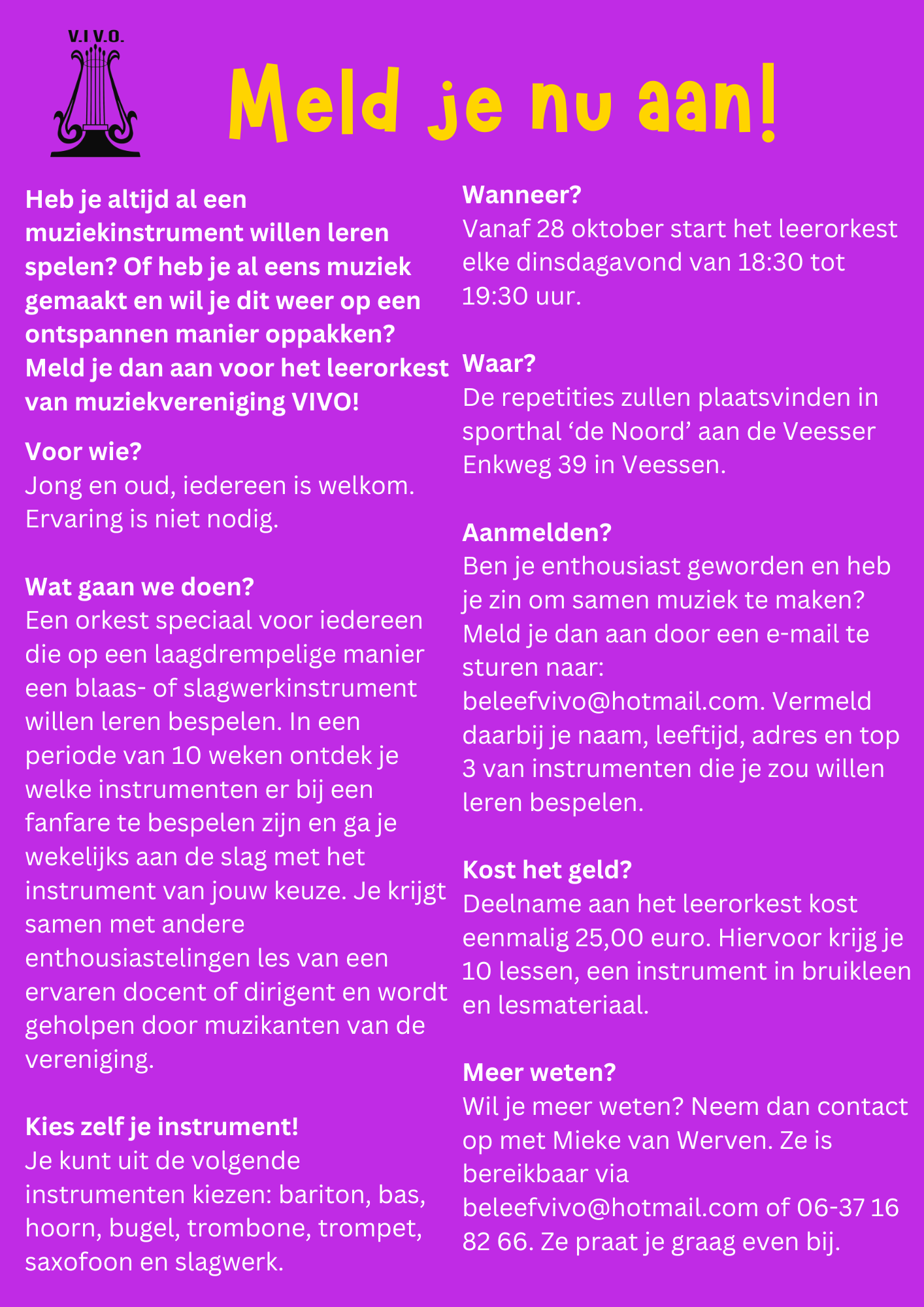 V.I.V.O. hoort bij Veessen en daarom vinden wij het belangrijk dat deze vereniging en het stukje kunst en cultuur in het dorp blijft bestaan. Wij zijn daarom actief gestart met ledenwerving.