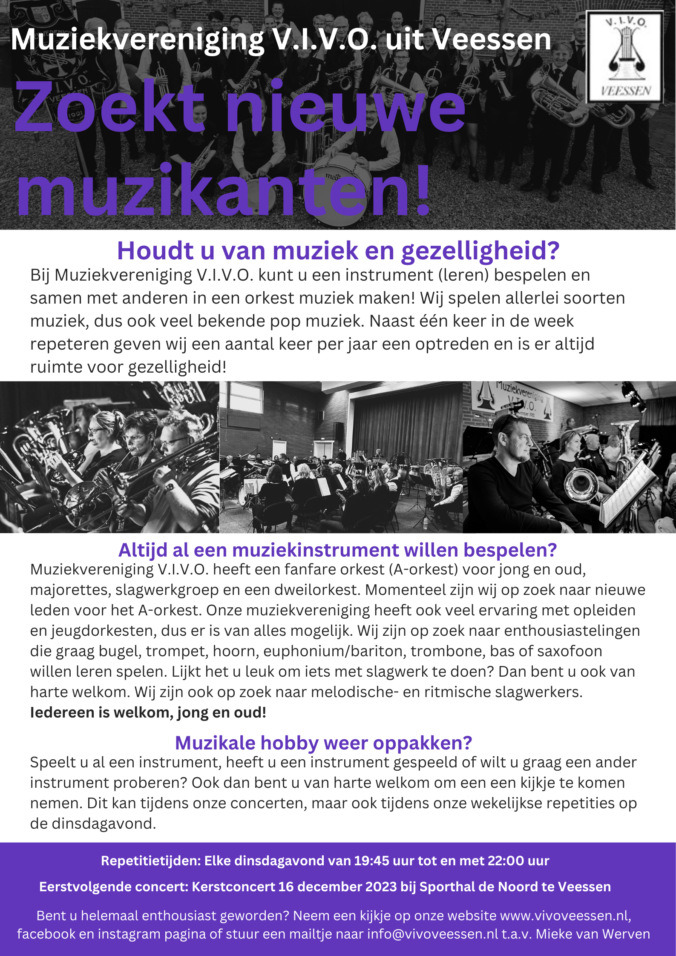 Muziekvereniging V.I.V.O. zoekt nieuwe leden! 21 november 2023 / V.I.V.O. / Geen reacties Algemeen Vorig bericht Kerstconcert muziekvereniging V.I.V.O. Volgend bericht Geslaagd voorjaarsconcert en huldigingen muziekvereniging V.I.V.O. Geef een reactie Reactie annulerenJe moet ingelogd zijn op om een reactie te plaatsen.